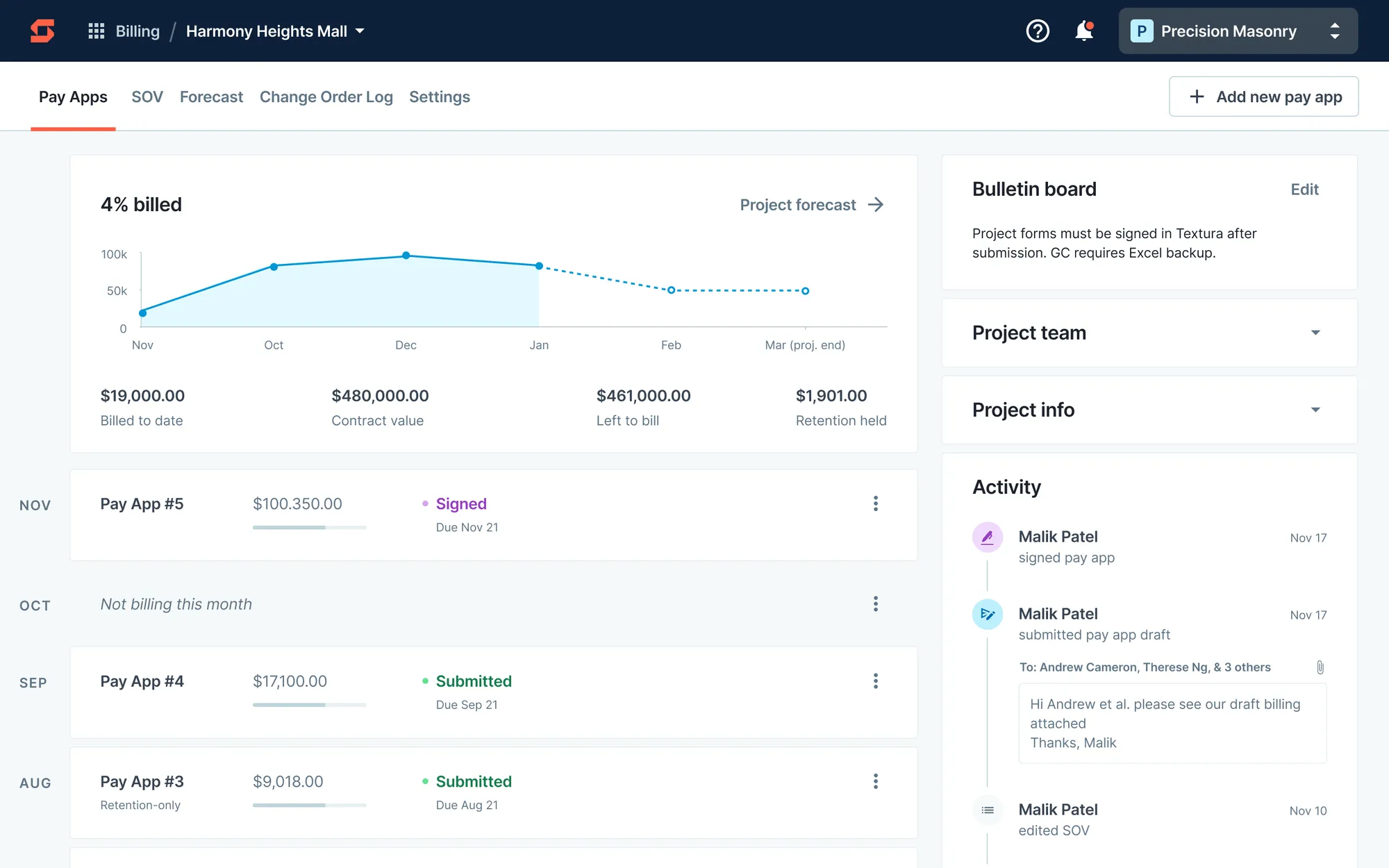 Centralize and visualize your entire billing workflow. From PMs to CFOs, the team collaborates on billing and manages all pay apps within Siteline, unlocking visibility, enabling new efficiencies, and optimizing communication.
