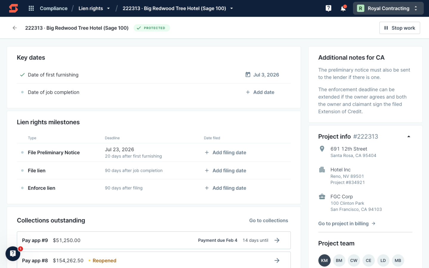 Lien rules vary by state, project type, and milestone. Siteline applies those rules behind the scenes and calculates the deadlines and required actions that matter for each project without requiring teams to interpret lien law on their own.